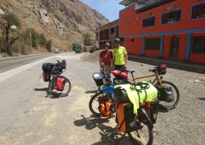 We got up at 5:45 AM, had breakfast, packed our belongings and got ready to cycle again. Leaving Lima was a very gentle incline but already being a bit further up in the mountains now the climb was steeper. The continuous incline and the burning heat of the sun made for a strenuous ride and we needed several short breaks for a bit of rest and to stay hydrated. Because the highway had no shoulder on our side of the street attempting to drink while cycling was out of the question. At least the traffic had calmed down a bit and was not as terrible as in Santa Clara or Chosica, albeit still dangerous.