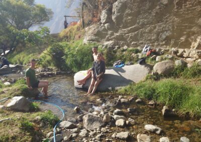 Thanks to their dedication, we could now hike to the waterfall with the comfort of knowing that all our belongings were safe. The hike was pretty and the waterfall very nice to see, a bit less nice to wash under because the water was very cold. After we had washed we went away from the lower part of the waterfall where more tourists and locals were gathered and moved back up to the upper side where a pleasant stream fed the waterfall. There, we found a good place to sit and completely relaxed with the warm rays of the sun on our cold but washed skin and the pleasant sound of the mountain stream. What had started out as not such a great day had quickly turned into a highlight as we happily sat there in the sun.