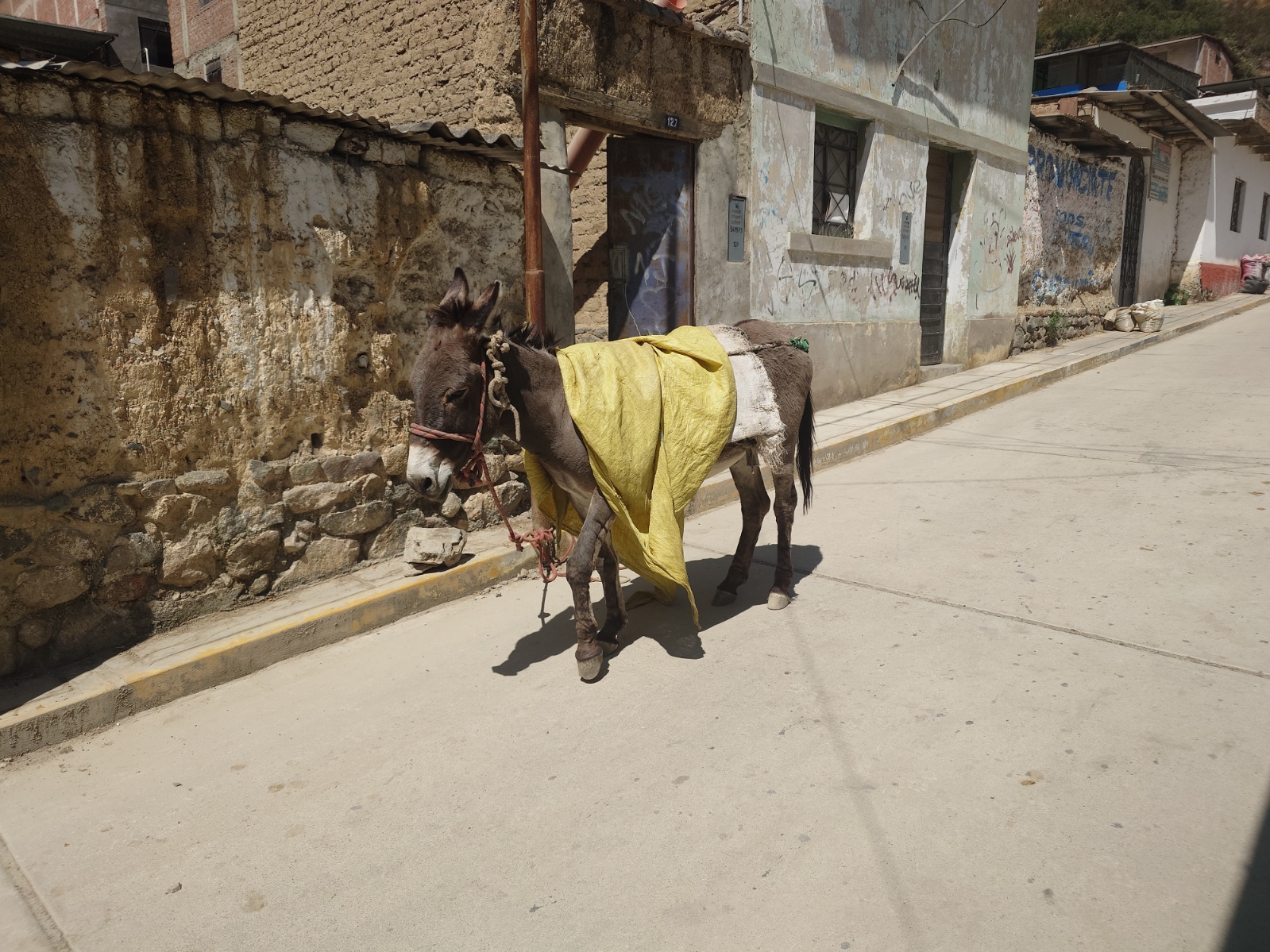 We crawled on bit by bit but as the air got thinner and energy levels sank, we decided to stay in Surco for the night rather than cycling on to Matucana. It was early in the afternoon so we still had quite some time ahead of us so we went to the place where Google and Apple Maps promised we’d find a camping. After pushing our bicycles up a steep, bumpy gravel road, we were sorely disappointed when the campsite no longer turned out to exist. Instead, we found a small uneven patch of grass with a donkey happily grazing in its midst.