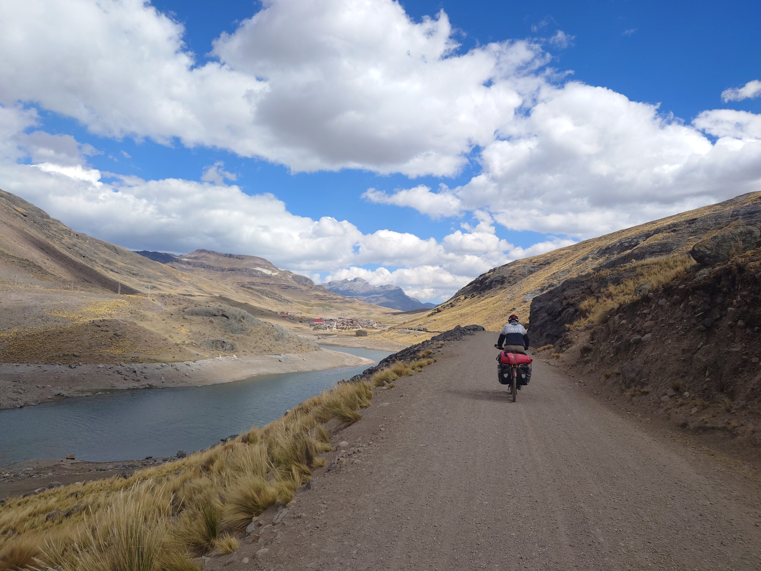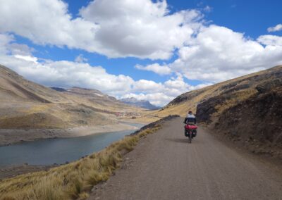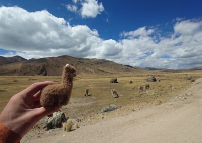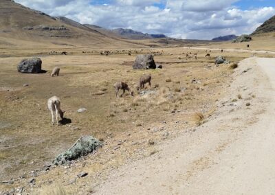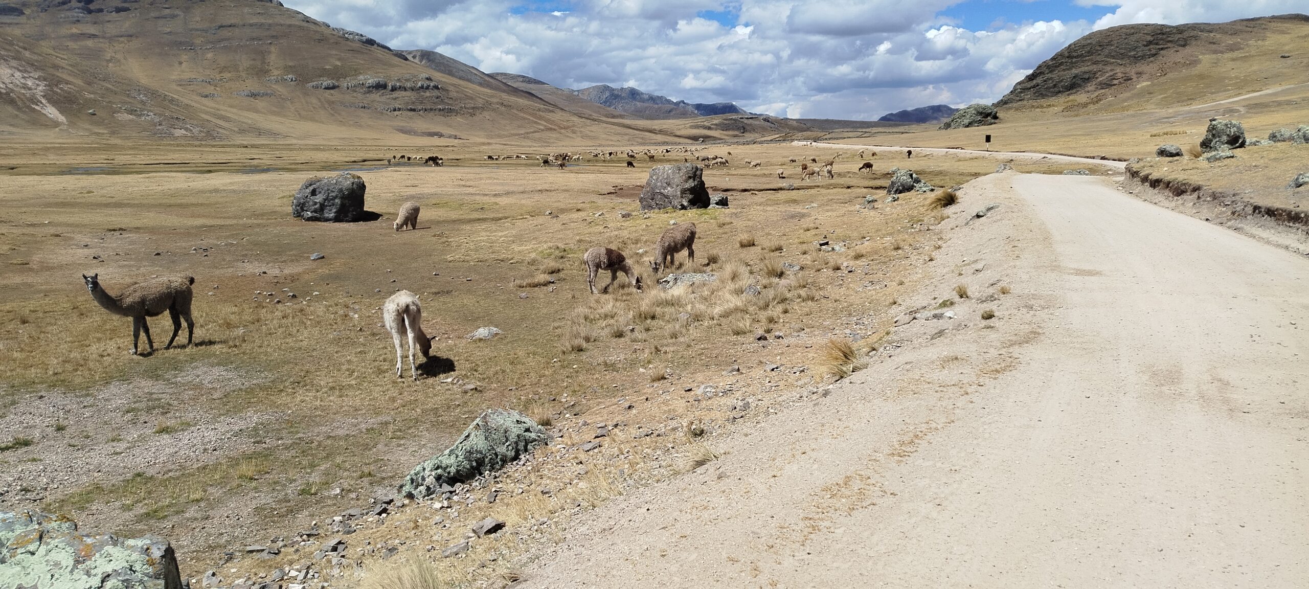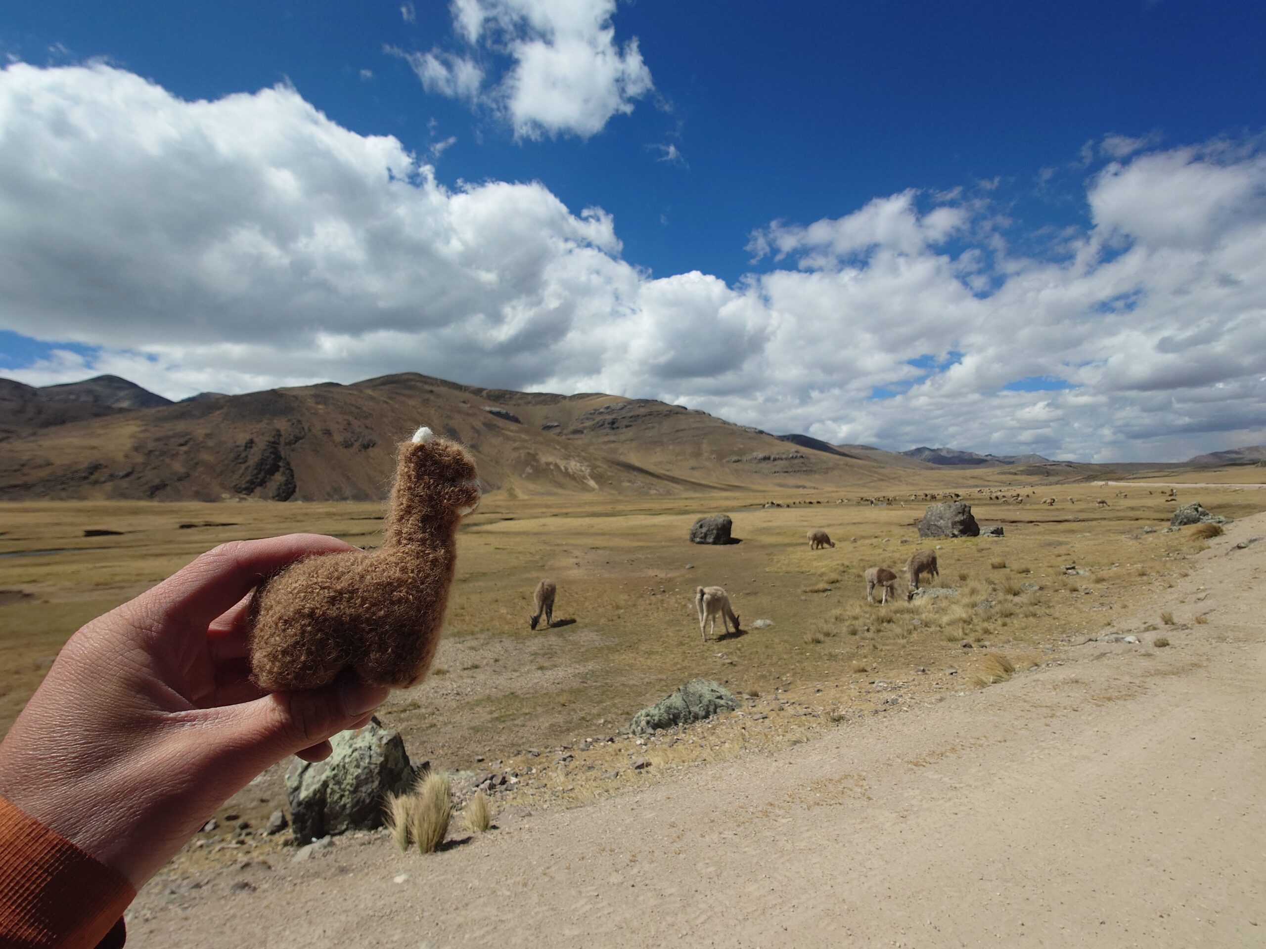 The climb was strenuous and my legs were tired from all the previous days of cycling or pushing my bicycle uphill (or should I say up-mountain?). After we finally reached the pass, we cycled downhill in the freezing wind, which managed to penetrate nearly all our layers of clothing. Because it was so cold, we decided to cycle on despite it being well past lunch time and our stomachs were grumbling. After another hour, we cycled around a bend and suddenly faced a huge flock of Alpacas and llamas. We were delighted to see them and as we stood there watching we realized that there was barely any wind. On top of that, the sun came out too so we decided to have a snack, right there amongst the namesakes of our blog, before facing the remaining 8 km to Tanta, where we intended to have a proper warm lunch.