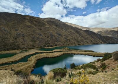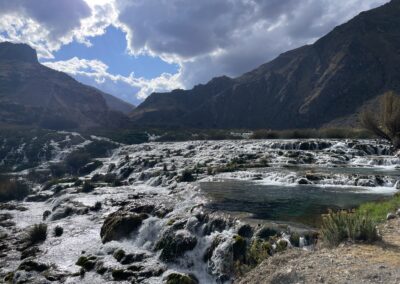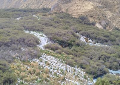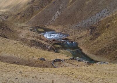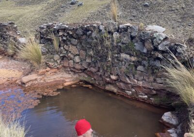 Today’s route would take us further through the nature reserve and past a ‘baño del inca’ (a hot spring tied to Inca history). Although a short fairly light climb for a few kilometers out of Tanta reminded me of just how sore my legs were, this was quickly forgotten after we were surrounded by beautiful and diverse scenery on our way down the valley through the national park (I looked it up for you, it’s ‘Nor Yauyos-Cochas’). Around 8 or 9 km after we left Tanta we arrived at the baño del inca. It was a very mineral-rich natural well surrounded by old stone walls with small shrubs and wallflowers growing between the cracks. You could see the bubbles of the water and oxygen that were rising from somewhere deeper in the earth’s crust until they met us at the surface of the small pool. After days of dips in icy mountain rivers and cold showers we were very excited at the prospect of soaking in a warm bath. Alas, the definition of a baño del inca doesn’t put that much emphasis on the ‘hot’-part and more on the ‘spring tied to Inca history’-part. While the water was warmer than the rivers we bathed in, calling it warm was a far stretch.