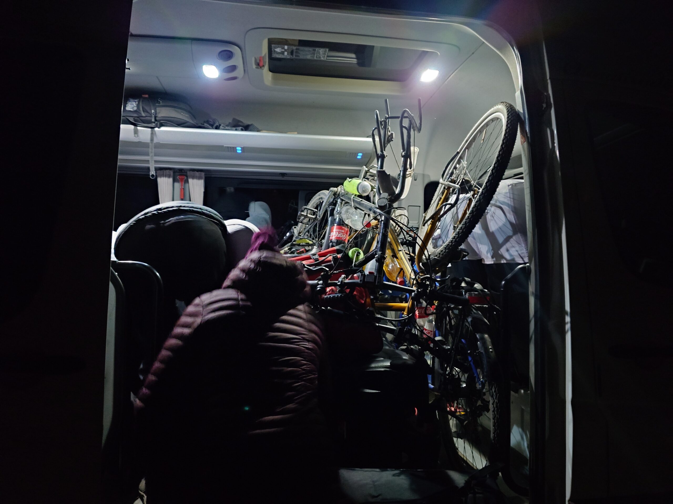 He had a special Andean alcoholic herbal tea with caramelized sugar made to warm us up and toast. It was surprisingly tasty and soothing for my upset intestine despite containing alcohol. After some chat and a few jokes, Diosdado called for the bus so we packed our belongings to see if we would fit in. We were a bit bummed when the driver said it wouldn’t fit, but we had looked forward so much to reaching Huancaya and travelling there with Alexia, her sister, and father, that we didn’t take no for an answer easily. After a few alternative suggestions, we decided to try taking out the front tires and voilá: with a bit of puzzling Jacques and Göran managed to fit in all three bikes while I was Tetris-ing our bags into the full trunk.