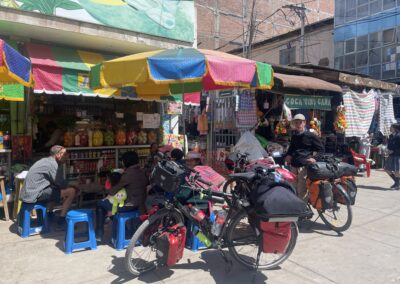 In the morning we made use of the fact that ATMs were available one more time (they are hard to come by in the tiny villages we usually pass through) and bought fresh produce such as vegetables and bread. Although we were eager to head out of the noisy town we found one thing that made us stay a bit longer: Next to the market there were little stalls that sold fresh smoothies, fruit juices, homemade breakfast cakes, and buns with fried egg or cheese. So we sat down amongst the locals and had a fresh smoothie with banana, cactus, beetroot juice, apple and another fruit that I didn’t recognize the name of when the local said it. It was delicious and while the men took a ‘pan con huevo’ I opted for the home baked breakfast cake. Everyone who knows me knows that I have a weakness for pastry and good versions of those are hard to come by over here.