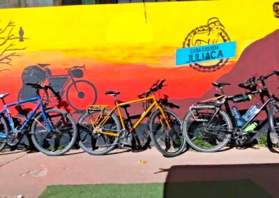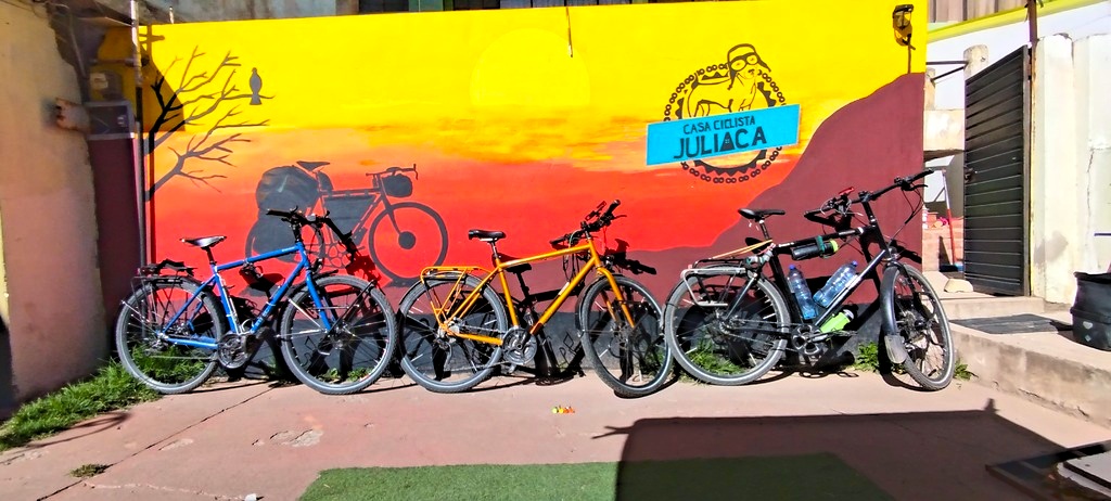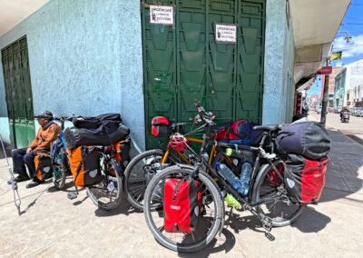 After going to the supermarket to buy some bread and more peanut butter and buying some fresh empanadas at a street stall, he was therefore in a hurry to get out of the city and begin getting some kilometres on his counter. Unfortunately, things went amiss only around 5 minutes after we left the supermarket. Luckily, Jacques didn’t get hit by a car in its total, but by a car door of a woman who didn’t look before she banged it wide open, knocking Jacques and his bike over onto the corner of the concrete pedestrian sidewalk. We were all shocked and furious at the lady for her carelessness. Luckily he was wearing his helmet and the wide bags prevented one side of his body from being squished under the bike too much during the fall. Nonetheless, he was injured. There was a deep, long cut on his finger at first sight that was heavily bleeding and he certainly sustained some non-visible or not yet visible injuries such as heavy bruises or overstretched tendons (Zerrungen und Prellungen) as well.