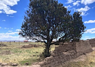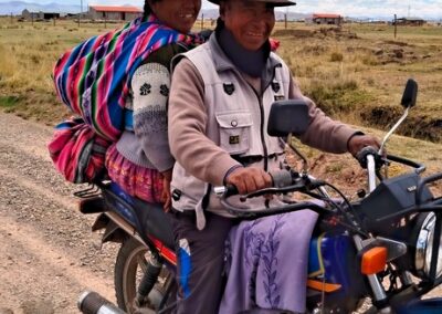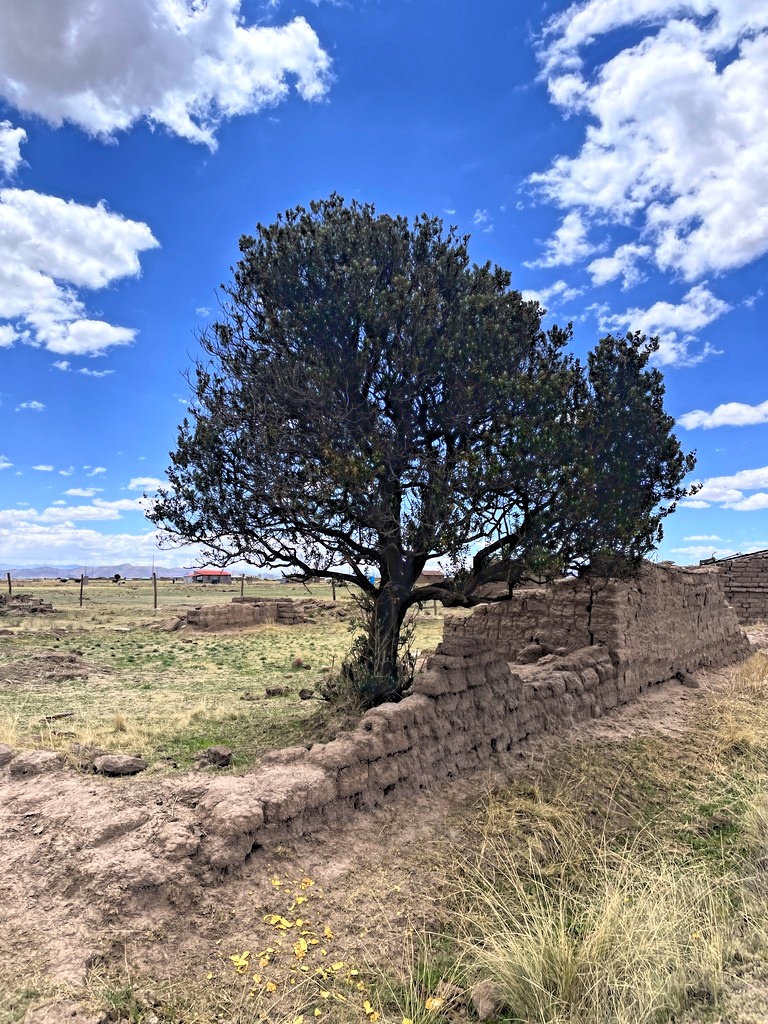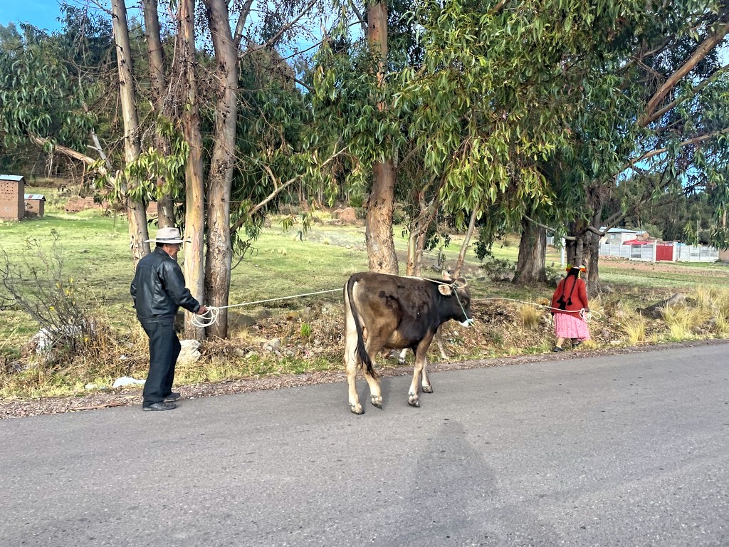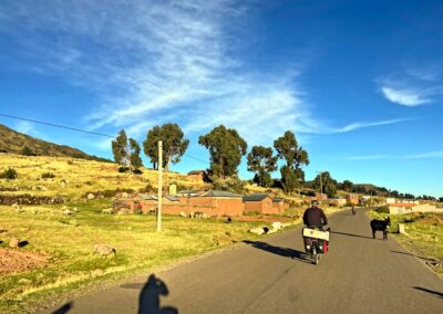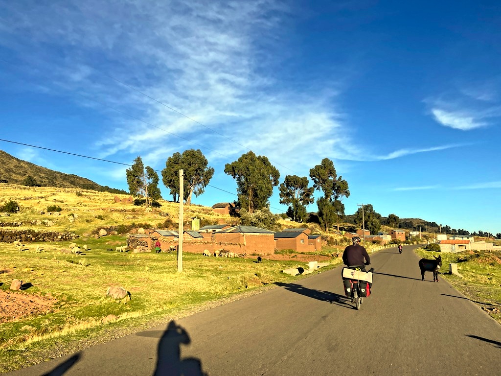We cycled on for around 10 km until we found a place where we could finally eat the pineapple Göran had bought the day before. Preparing it is a labour of love, but it is worth the effort, and with all my stomach issues we try to mainly buy produce which can be peeled if we intend to eat it raw. Less risk of harmful bacteria entering my body and halting our progress. We sat on a crumbling clay brick wall under one of the few small trees that graced the barren and flat Altiplano landscape. We subsequently cycled on for many kilometres with a gruelling headwind, until we had lunch in a field, only to continue cycling with headwind afterwards. We eventually reached the peninsula we had chosen as our route, based on Giovanni’s advice. From here on, we still had quite some kilometres left to go, but at least the scenery changed and turned much more beautiful. Due to some complaints about the length of my stories, I will not describe it, but hope that we will find a picture on one of our phones that manages to do it some justice. In reality, it is prettier and greener than in most of our photographs though. On our way to Llachon, we reached a small village where all people seemed to either be dressed in traditional clothing or in their Sunday best. The people we asked didn’t want us to take pictures of them, so we respected that, but they were willing to answer why they were all dressed up, celebrating, and heading towards Puno. Apparently, it was a regional anniversary celebration and not only the people, but also the town had been decorated and scrubbed up for the occasion.