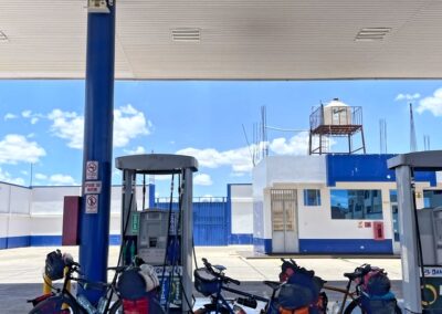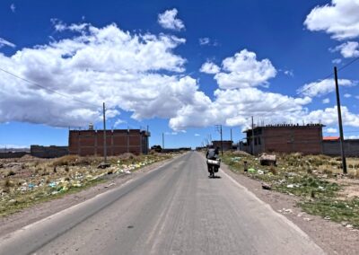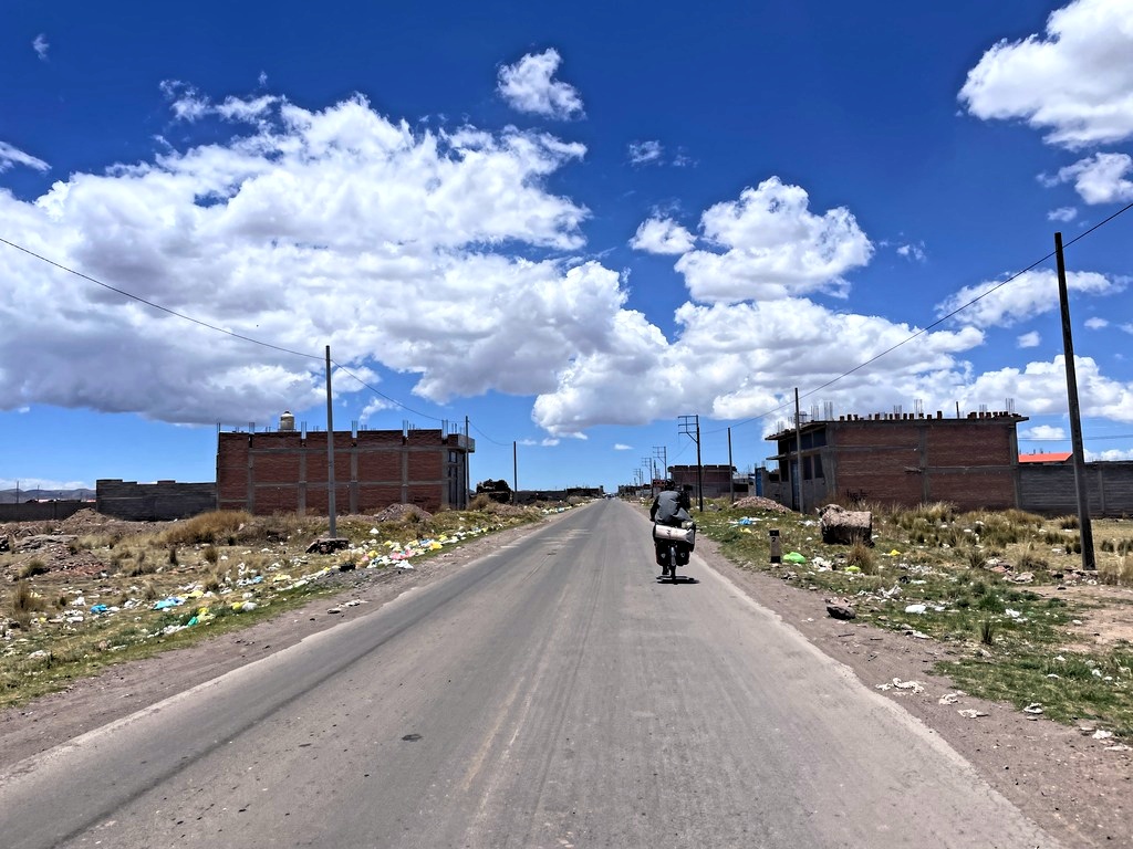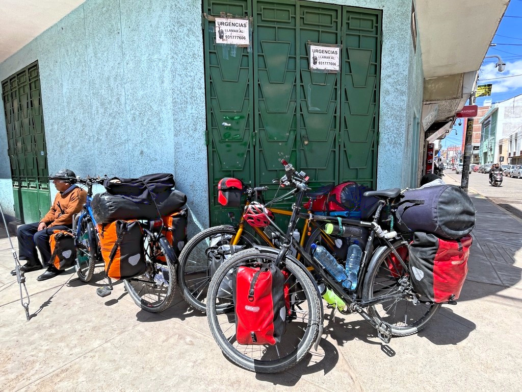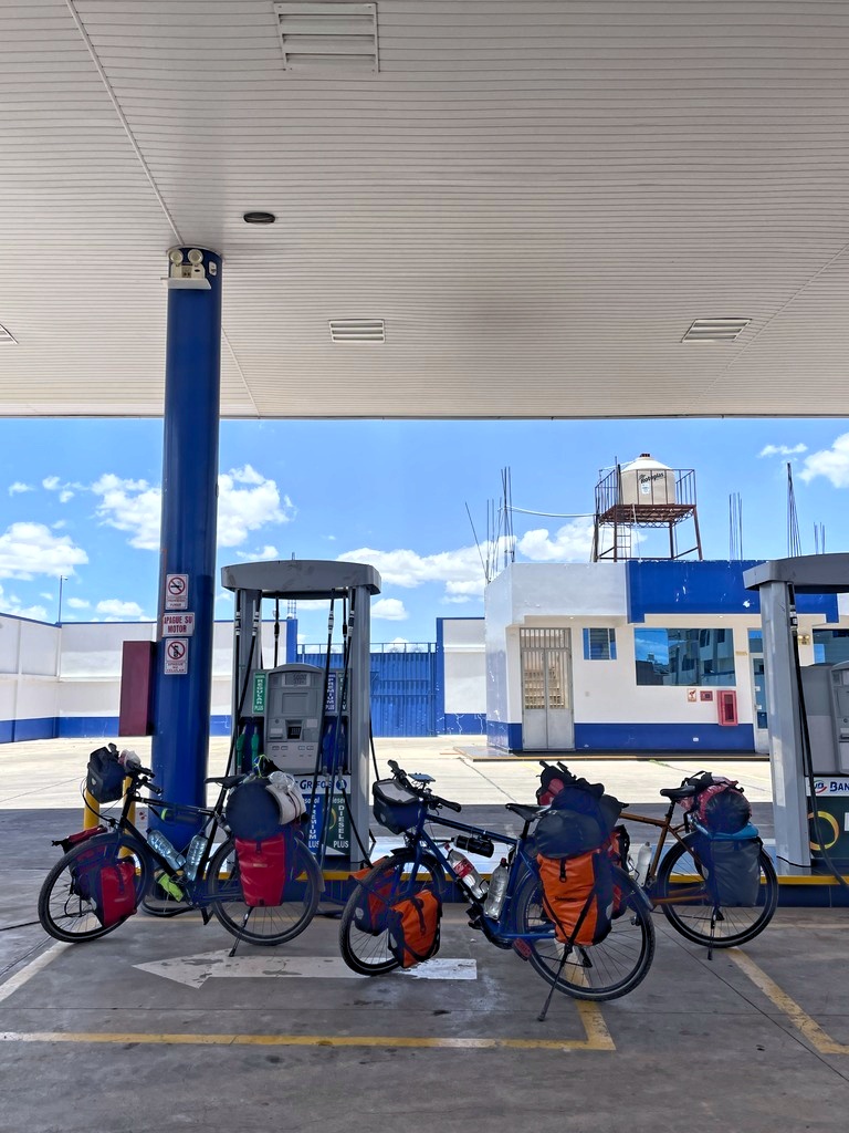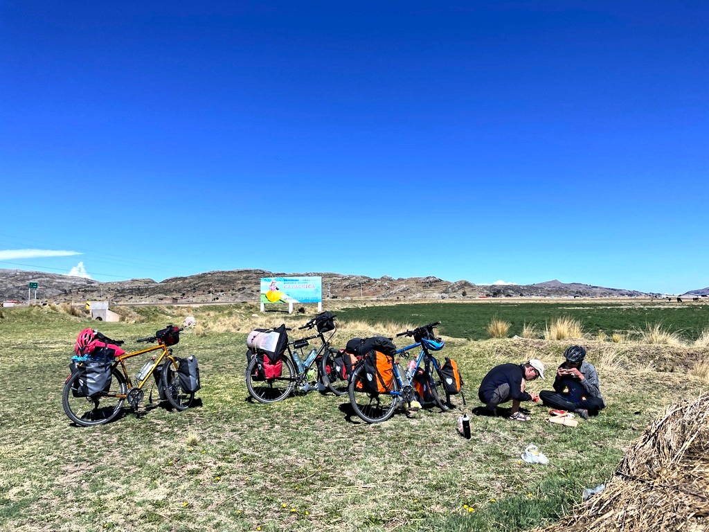 Switching to past tense now, because obviously I am writing this part after everything had unfolded. When Jacques and Göran returned, all was well. I had bought Jacques some freshly squeezed orange juice to get his blood sugar levels back up and to pamper him a little after what had happened. Göran had done a great job accompanying and assisting him. All in all, we had distributed our tasks very quickly and very well and were happy with how we had handled the situation. We continued cycling (with more care than before!) on a road that led out of the city and was sadly bordered by loads of garbage on both sides, until we reached a gas station on the outskirts of Juliaca. There we refilled our fuel bottle and enjoyed our empanadas which were still warm. They were filled with a truly delicious, juicy and well-spiced filling of vegetables, potato and two small pieces of chicken, which I took out and gave to the men. Afterwards we cycled through a pretty boring and barren landscape with strong, chilly gusts of wind coming from… the front? I don’t think that’s an actual way of expressing it, but you guys are smart enough to know what I mean 😉