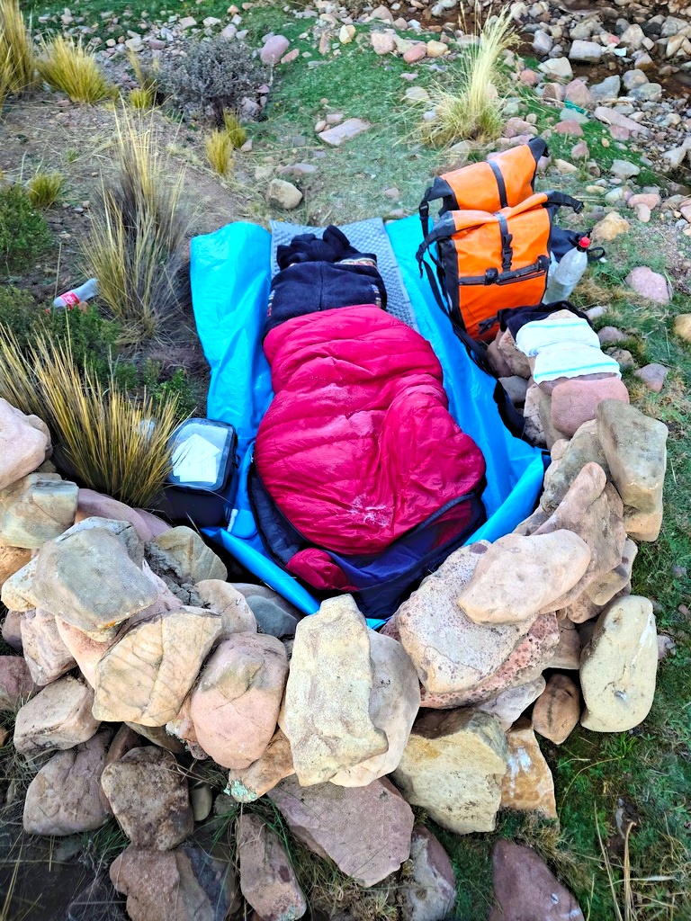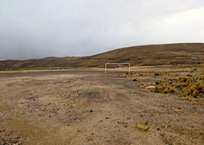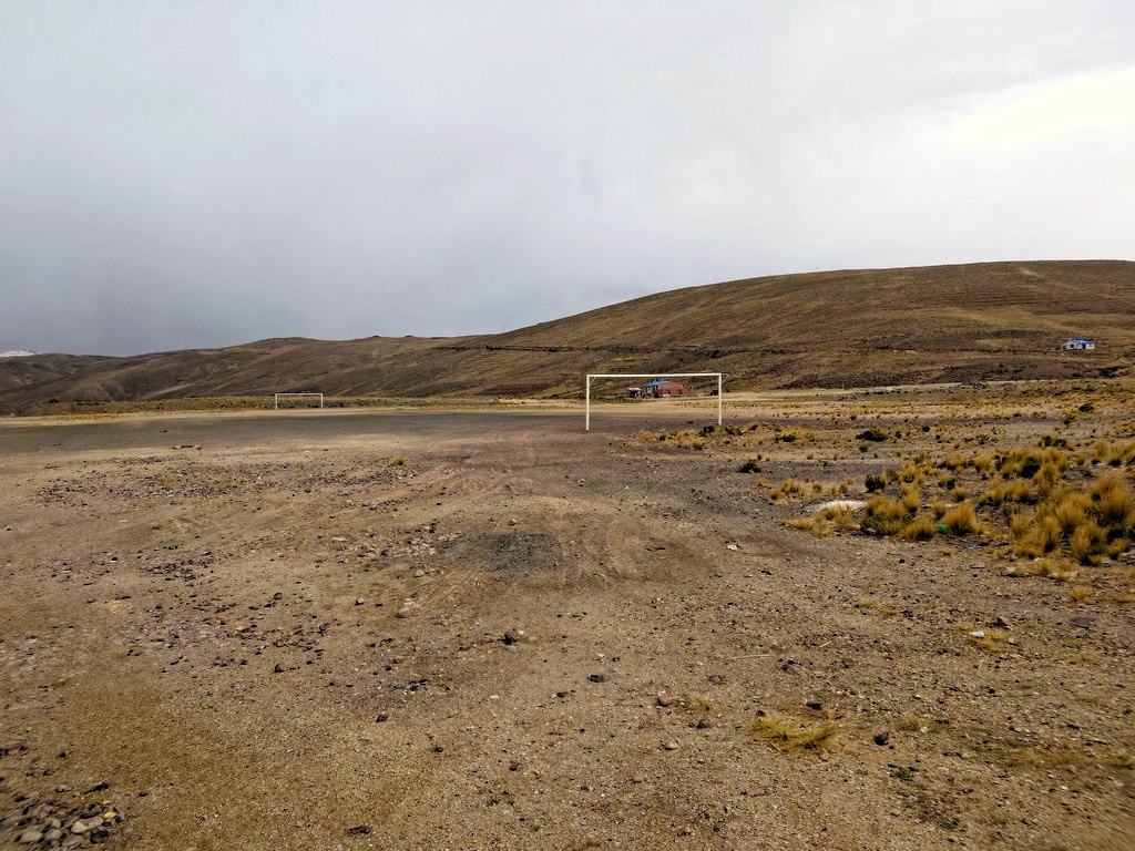 Once we were on the other side and thereby officially out of the Altiplano, we had lunch in the valley where it was slightly less cold and windy. Stale white bread with peanut butter. Yum. After lunch, the wind suddenly picked up, the sky turned dark and it was evident that heavy rain and a thunderstorm were coming our way. For some reason, Jacques and I were completely low on energy after lunch and dead tired. Since we wanted to sit out the storm anyways, Göran suggested that we set up the tent so that Jacques and I could take a nap before we would continue. So we turned ourselves into the talk of the town, especially for the children, as we set up our tent next to the soccer field (a large patch of flat rocky dirt with two goal posts) under the watchful, curious gazes and chuckle of the local children.