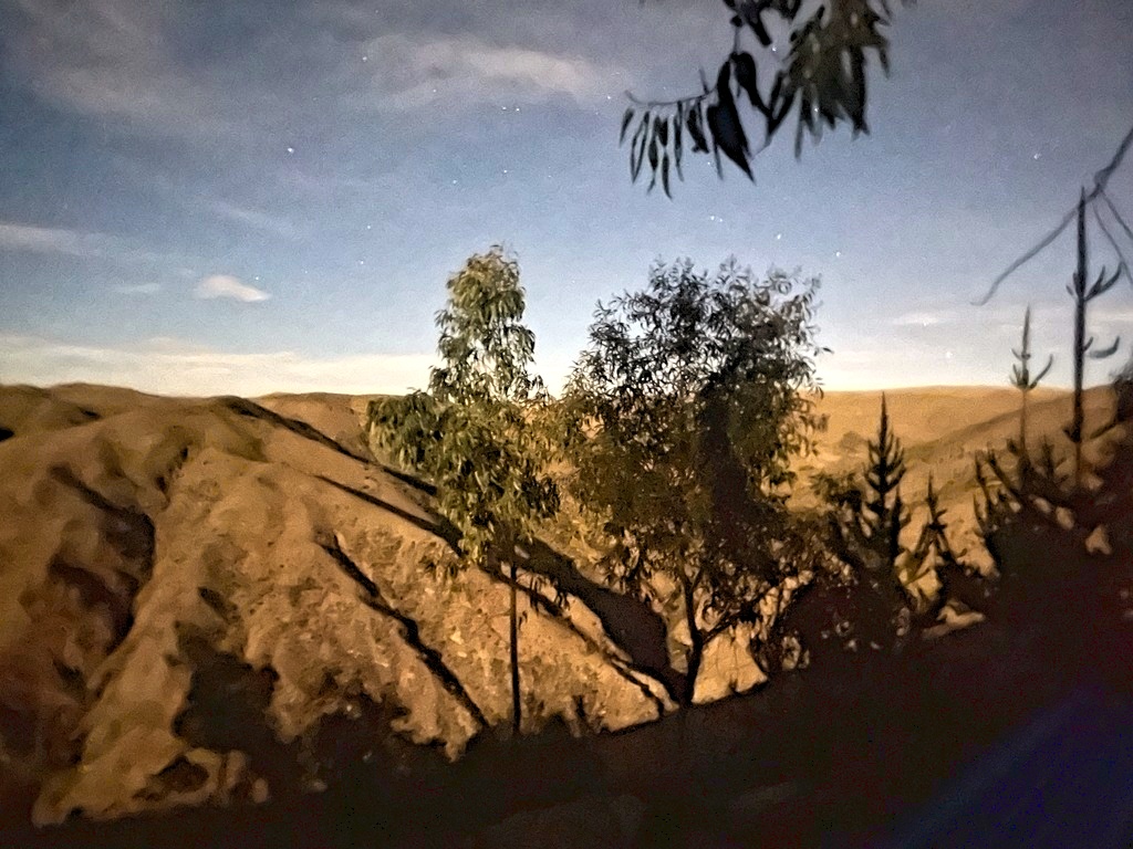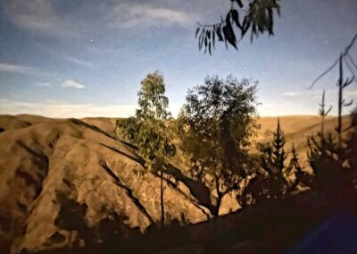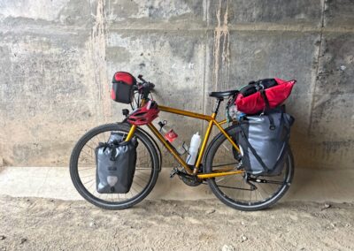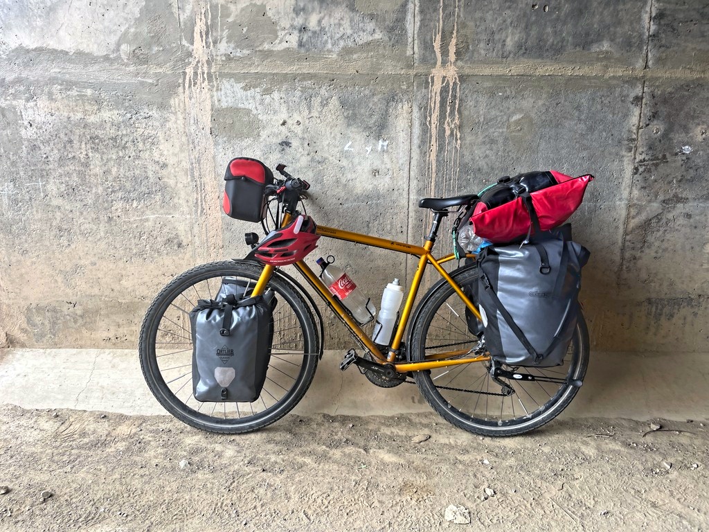 We went on for a while, cheered on by some very kind road workers along the way, until it became too dark and dangerous to continue. The road conditions were quite bad and despite our good lamps we usually couldn’t see bumps, potholes or other obstacles in time the darker it got. We decided to call it a day and were lucky enough to find a very beautiful spot to camp close to the road but mostly out of view and partially out of earshot. We were surrounded by bushes and trees but had a relatively even spot to camp, and two well-distanced trees for Göran to hang up his hammock in. From where we were, we had a breathtaking view over the moonlit mountain valley. And best of all? It was above zero degrees that evening, so we all slept warm and happily that night.